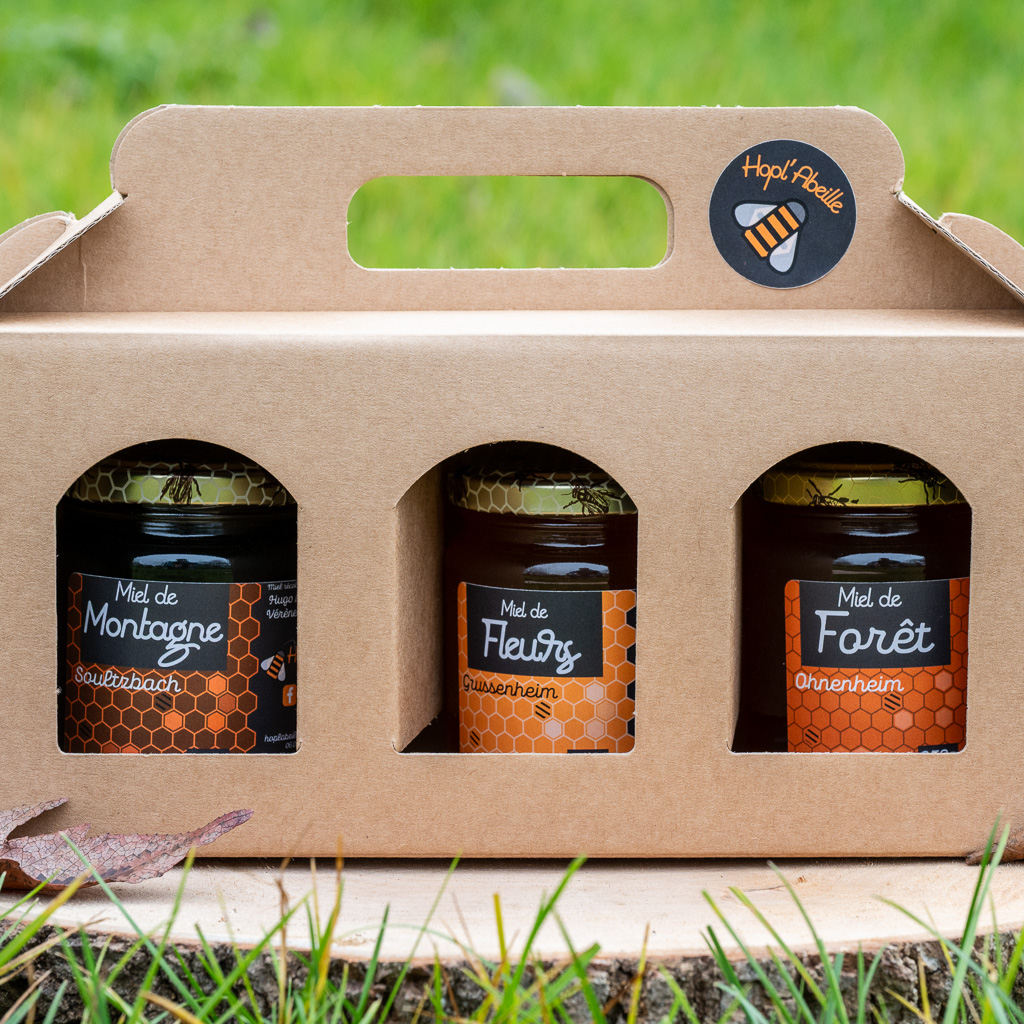 Coffret cadeau – 3 pots de 250g (fleurs, forêt, montagne)Coffret cadeau – 3 pots de 250g (fleurs, forêt, montagne)