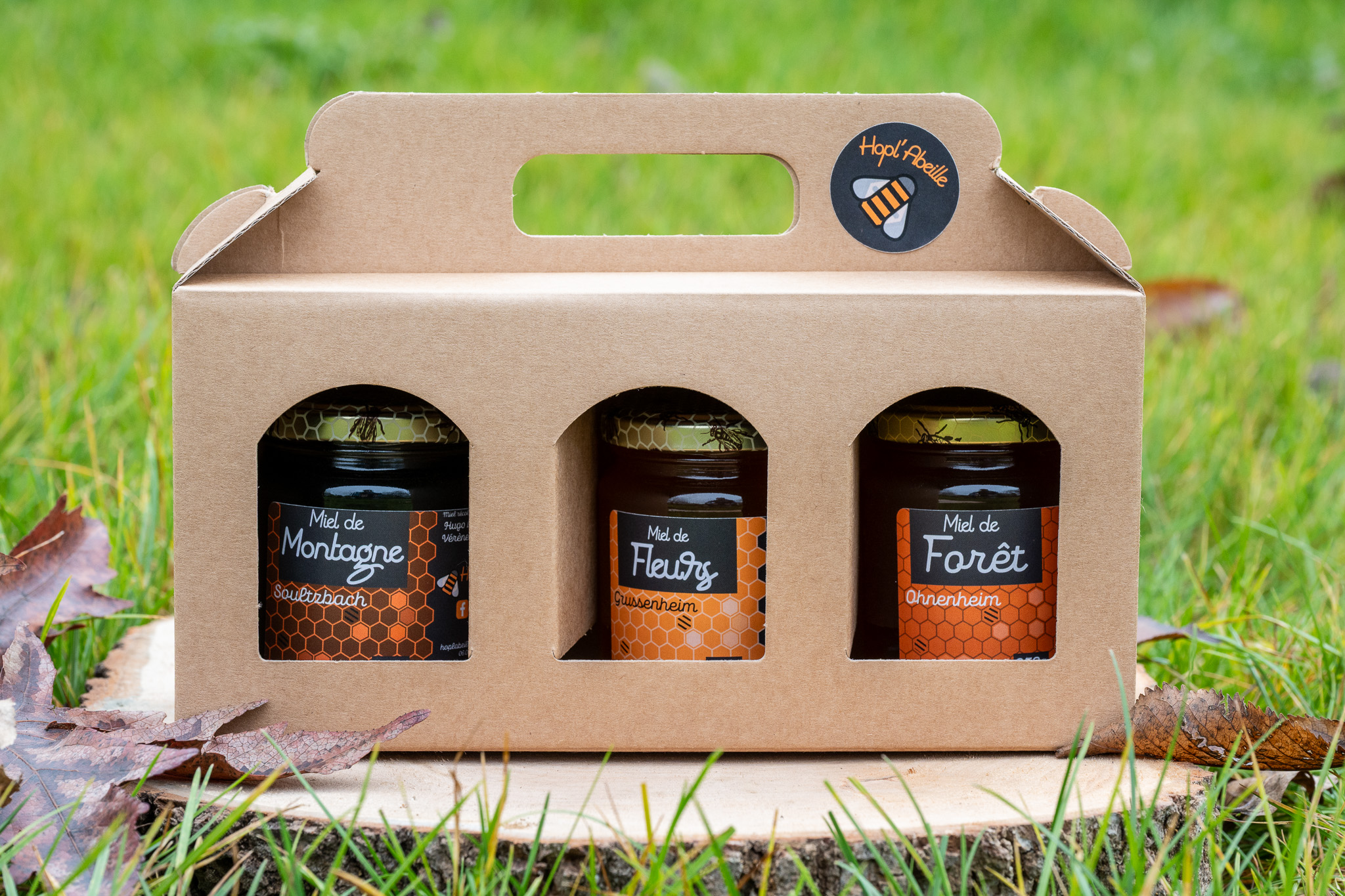 Coffret cadeau de 3 miels artisanaux d’Alsace : fleurs, forêt et montagne. Une idée gourmande et locale.